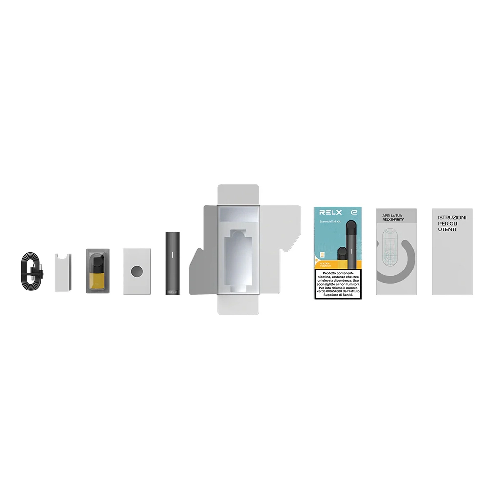 Dispositivo Essential starter kit Relx è il kit della sigaretta elettronica Relx essential con a sistema chiuso con pod precaricata usa e getta al gusto Golden Tobacco ( tabacco biondo).